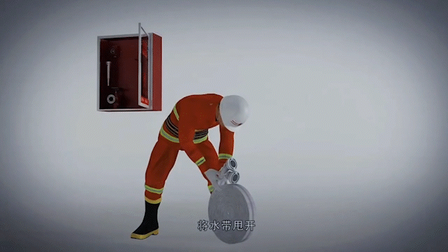 另一人整理好水带快速返回消火栓前,启动水泵按钮,按逆时针方向旋动出水阀门并开到最大。